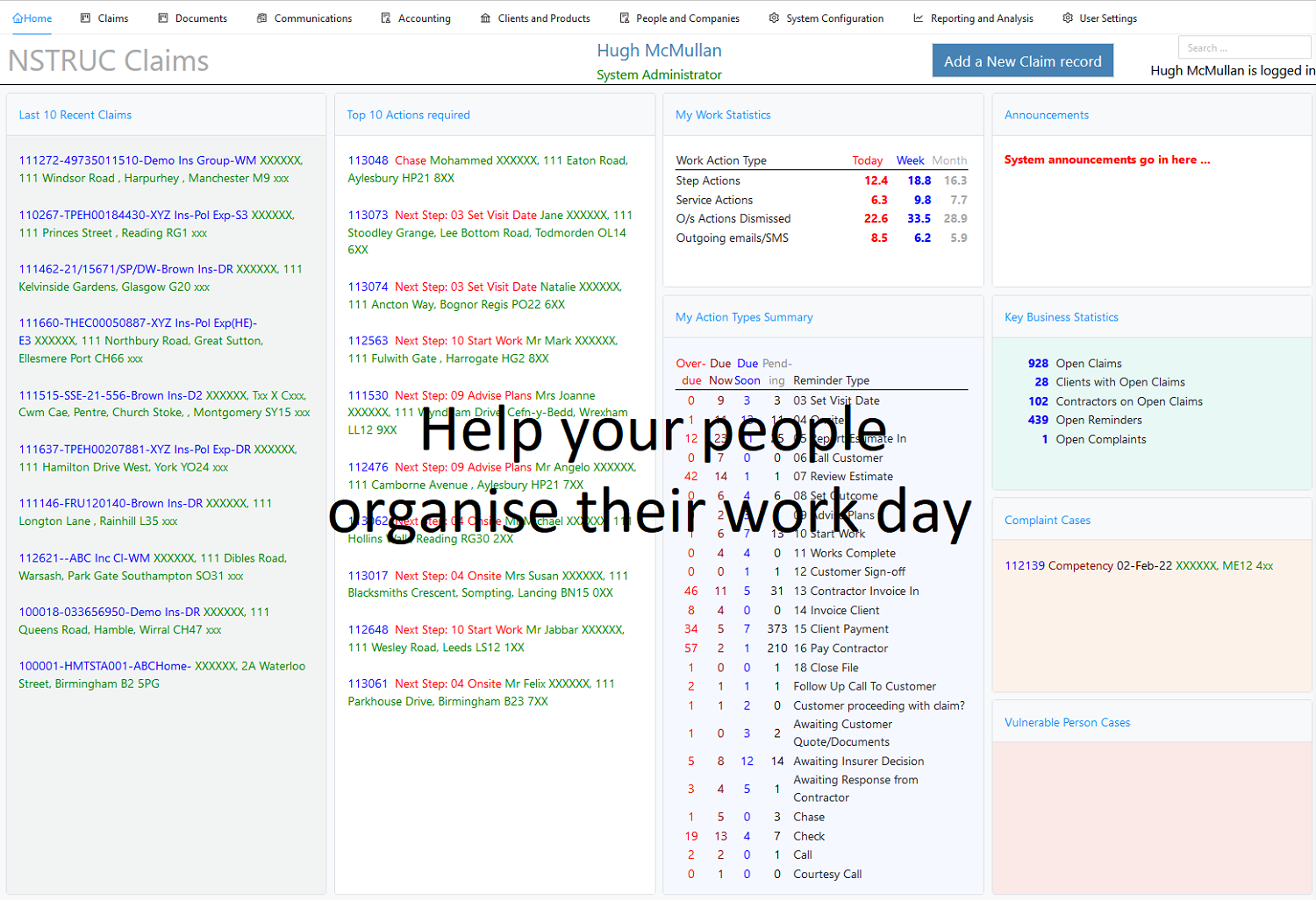 NSTRUC ClaimsManaging insurance property claims remediation Web-based claim records administration Managed communications for claim participants and providers Integrated reporting using Tableau Make It Manage all of the Claims Data